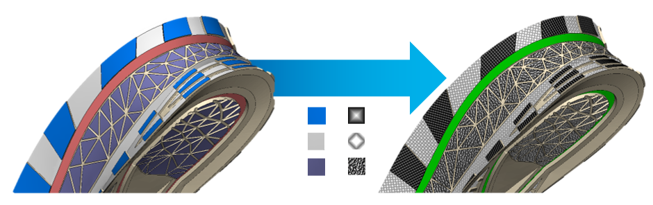 對于鞋子來說,最大的難度是一個鞋子上有上百個不連續的表面。例如在下圖中,所有藍色的表面需要貼同一種紋理,那么這些表面可以組成一個面組,一次操作流程就將所有需要貼一種紋理的面都貼好。我們叫這個過程為批量化紋理。
