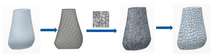 導入到數字化咬花模塊中的零件都是STL數據。當確定好需要貼紋理的表面以后,需要首先在表面上生成UV Map,用來確定將來紋理圖案的大小和方向等。之后就可以將已經準備好的帶有灰度的紋理圖案貼在UV Map上。軟件中根據設定黑白偏移的參數,直接在零件表面生成帶有凹凸的紋理STL數據,可以直接用于3D打印。