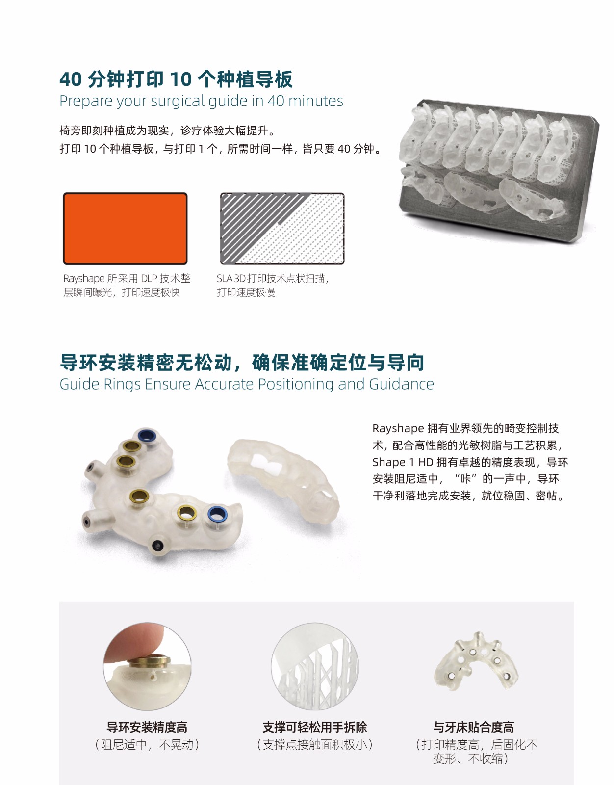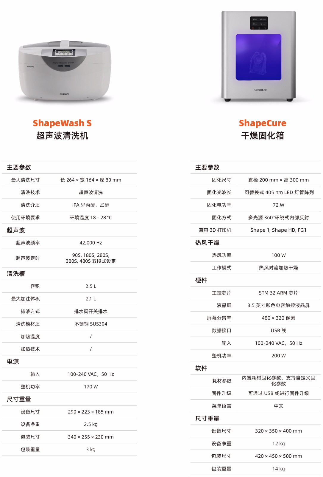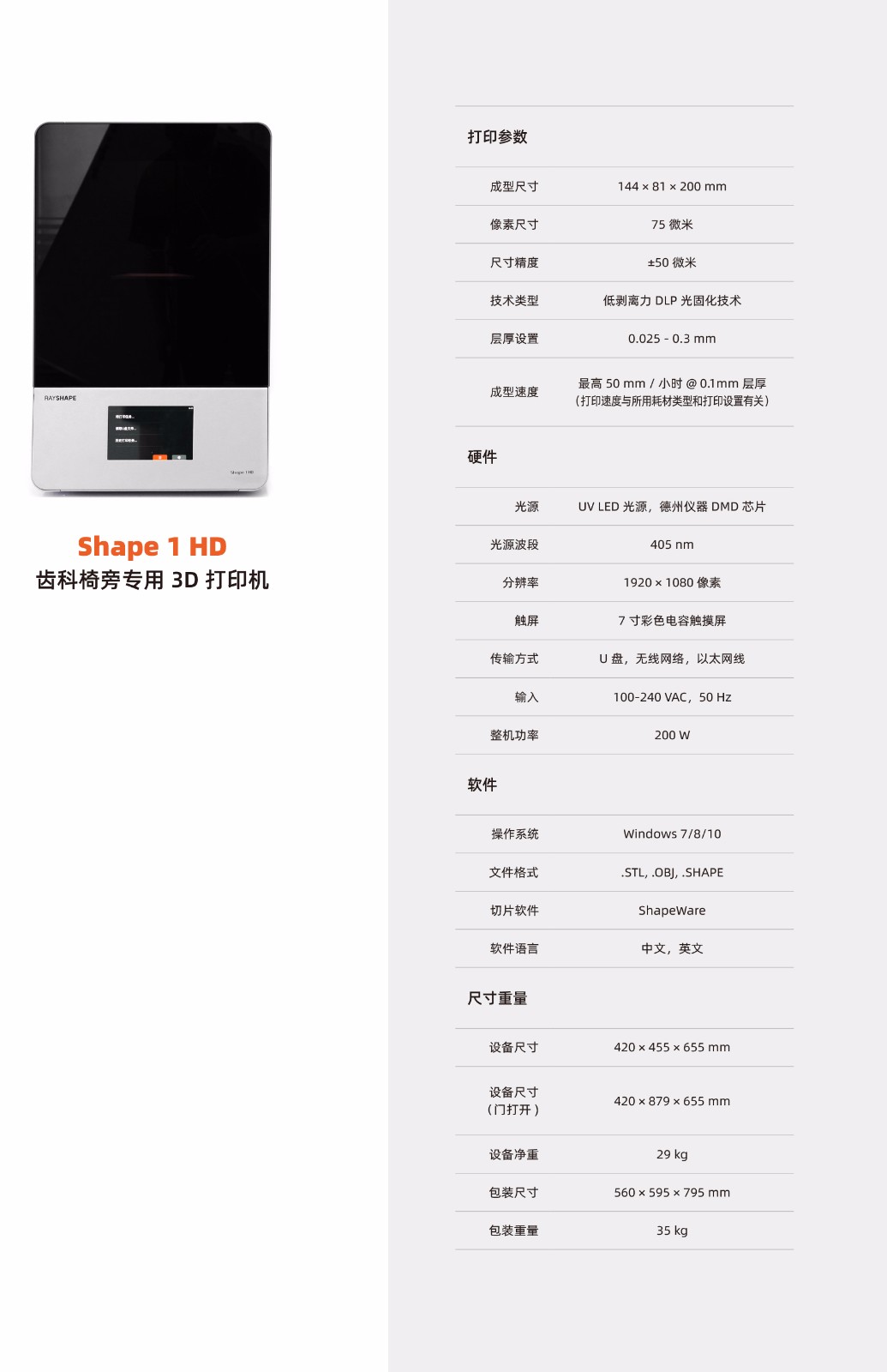 Shape 1系列3D打印機創新地將高速剝離技術與 DLP 數字面投影技術結合,使得 Shape 1 系列可以達到 50mm 高度 / 小時 * 的打印速度, 這意味著,單次同時打印多個 10cm 高的零件,最短只需要 2 小時。原廠三個系列共 20 款高性能光敏樹脂,且開放對第三方材料的支持可靠性與安全性并重辦公場景中使用的 3D 打印機產品,需要完善的設計ShapeMaterials 耗材體系涵蓋了 Basic、Functional、Dental 三個系列,可以滿足從概念原型、功能原型、模具、終端部件、醫療、文創、批產等多行業、多應用的需求。恒溫打印倉Rayshape 全系列產品皆配備恒溫打印倉技術,確保任何氣溫環境下光敏樹脂都能維持在最佳的粘度,避免因氣溫過低造成打印失敗??諝鈨艋疪ayshape 全系列 3D 打印機皆配備 HEPA 空氣凈化系統,降低氣味,減少光敏樹脂對工作環境的影響。安全門設計打印過程中若打開倉門,打印機會立即暫停打印,最大限度降低運動部件或激光對人造成傷害的潛在風險。Basic 系列包含標準黑、標準灰、標準白、精密、高速,共 5 款光敏樹脂Functional 系列包含韌性、剛性、耐磨、耐高溫、類硅膠、類橡膠、阻燃、防靜電、高透明、紅蠟,共 10 款光敏樹脂Dental 系列包含牙模、手術導板、正畸模、假牙齦、記存模,共 5 款光敏樹脂